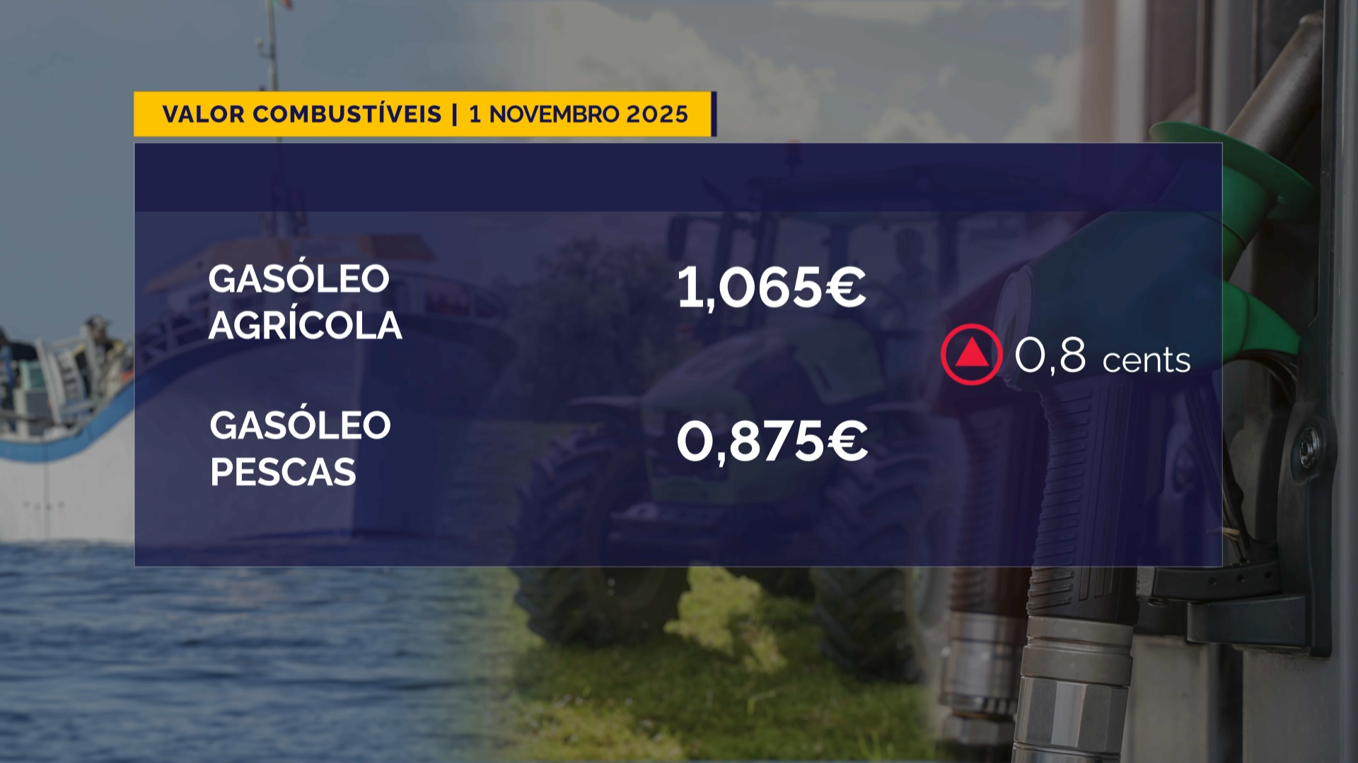 Também o gasóleo colorido para a Agricultura e para as Pescas aumenta 0,8 cêntimos por litro; na Agricultura passa a custar 1,065 euros por litro, enquanto na Pesca é fixado em 0,875 euros por litro.