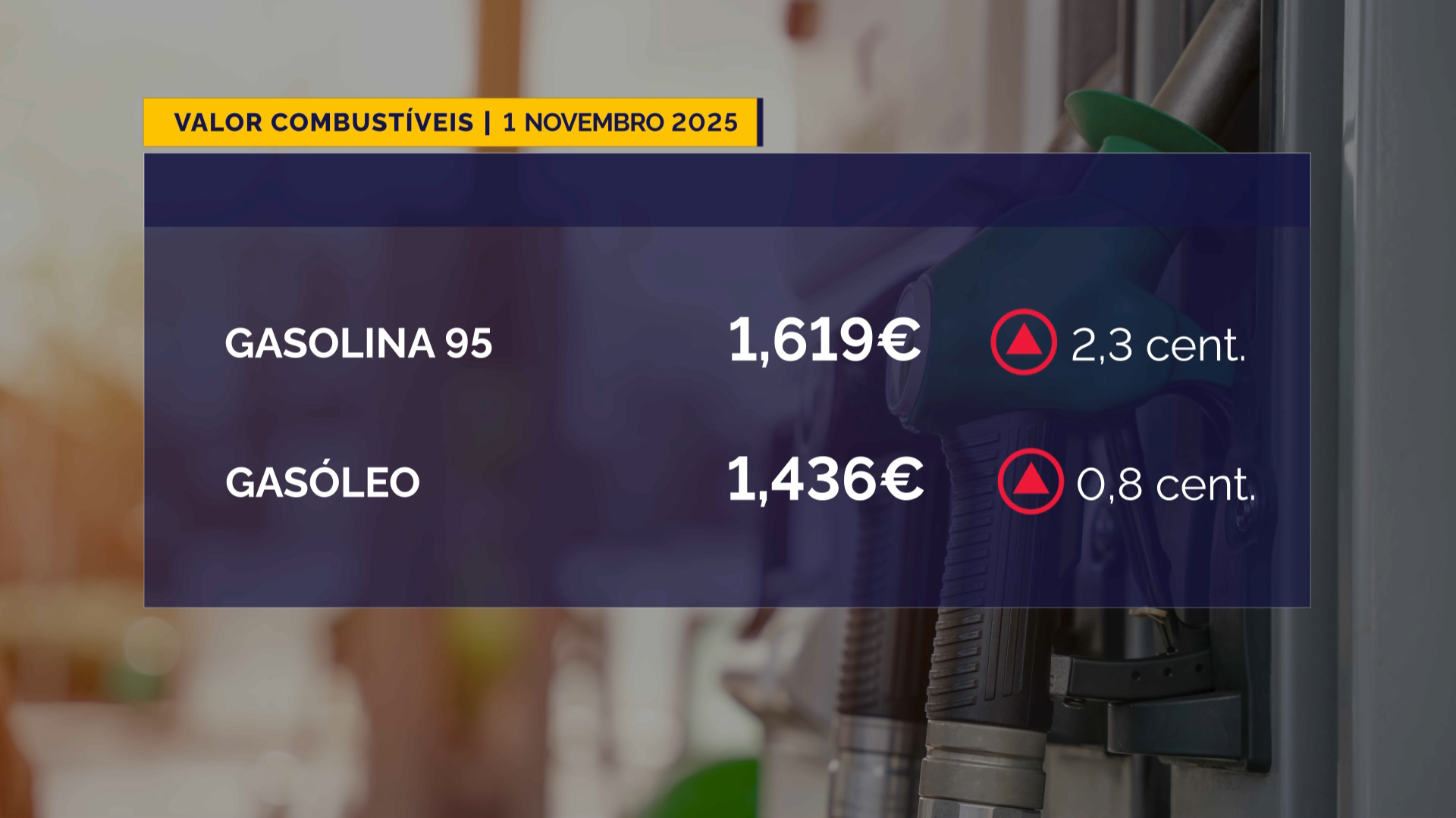 A gasolina sem chumbo 95 octanas passa a custar 1,619 euros por litro – mais 2,3 cêntimos do que em outubro.