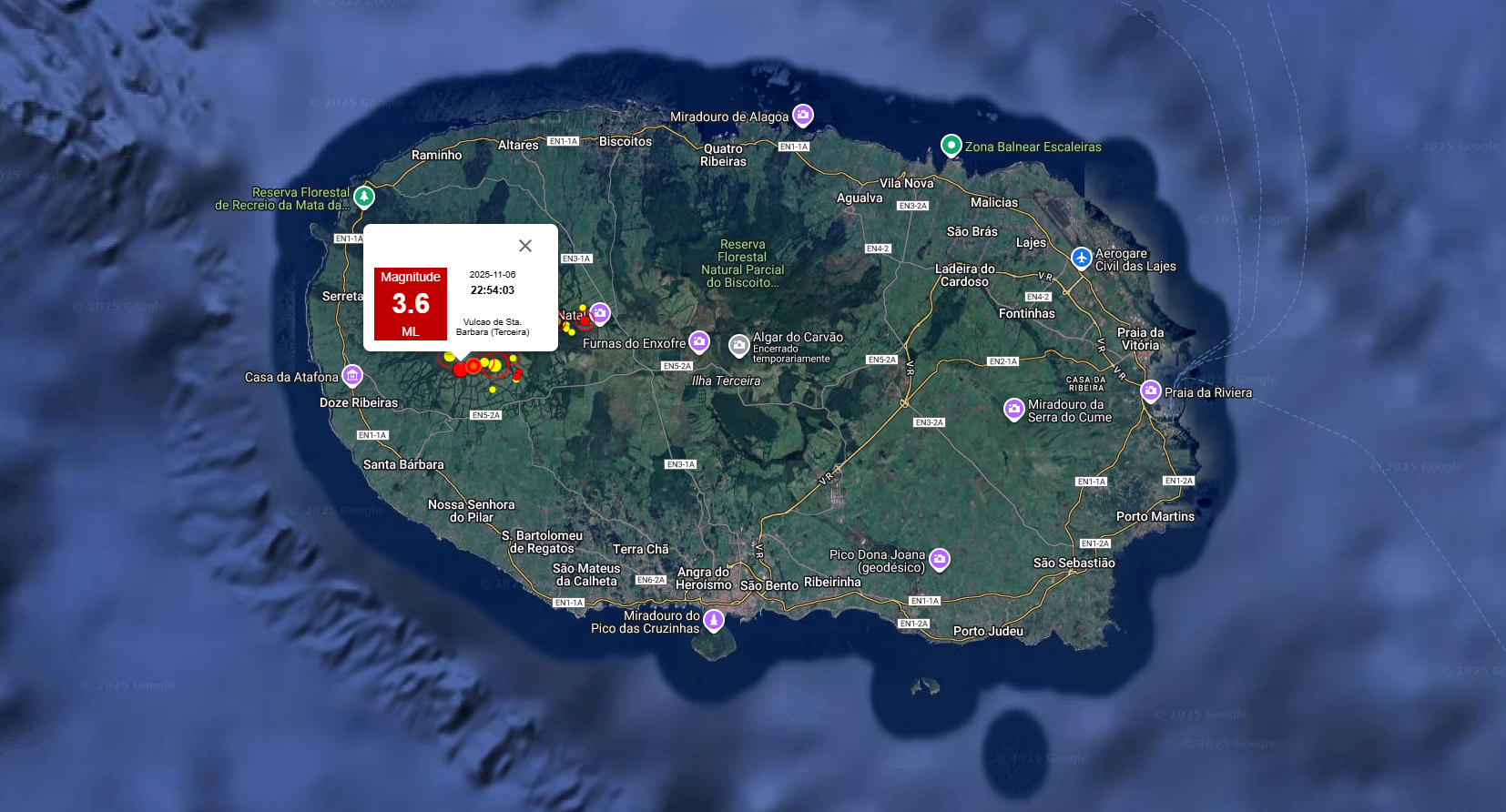 O Centro de Informação e Vigilância Sismovulcânica dos Açores registou dois eventos, às 21h54, com magnitudes 3,6 e 3,5 – Escala de Richter – com epicentro a cerca de três quilómetros a Nor-nordeste de Santa Bárbara e a quatro quilómetros a Nordeste de Santa Bárbara, na ilha Terceira.